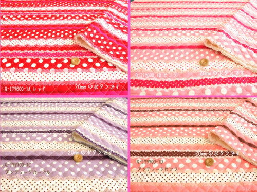 ![]() 価格: 135円 レビュー評価:4.56 レビュー数:43 +++++++++++++++++++++++++++++++++++++++++++++ 可愛いモチーフをたくさん集めてプリントした ≪Sweet Decoration Border≫レースとドット柄の生地です。大きさの違う水玉(ドット)や繊細な模様が素敵なレースをボーダーでプリント、甘いスイートテイストのキルティング生地です。レースにはとっても小さなハートを描いたものもありますよ。 入園入学などにもおすすめのキルト生地です。 +++++++++++++++++++++++++++++++++++++++++++++ ●キルティングはマス目に添ってカットしております。 加工の性質上柄に斜交が生じます。 ★生地巾 約105cm ★素材 コットン100% キルティング生地 ★☆オススメ作品は・・・・ イラストクリックでパターンのページにジャンプ! ●生地と一緒に糸はいかがですか? ★★ぴった (更新日時:2019/04/07 03:22) Supported by 楽天ウェブサービス |